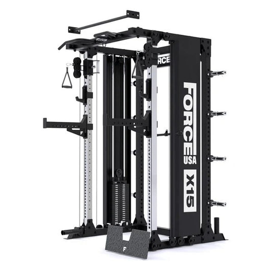 Force USA — засновник концепції багатофункціональних силових станцій All-in-One, які поєднують у собі можливості цілого тренажерного залу. Машина Сміта, функціональний тренажер, силова рама, тросові станції, станції для жиму, підтягувань, тяги та багато іншого - все це зібрано в одному рішенні. Це дозволяє виконувати сотні вправ для всіх груп м’язів, економлячи простір і ресурси.