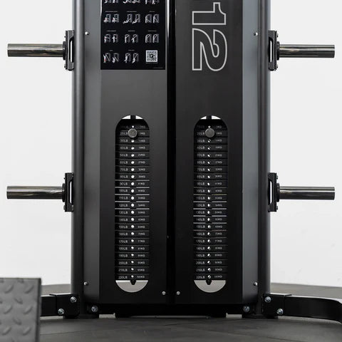 Force USA G12 оснащена двома ваговими стеками по 100 кг кожен із передаточним співвідношенням 1:1, розташованими ззаду станції.