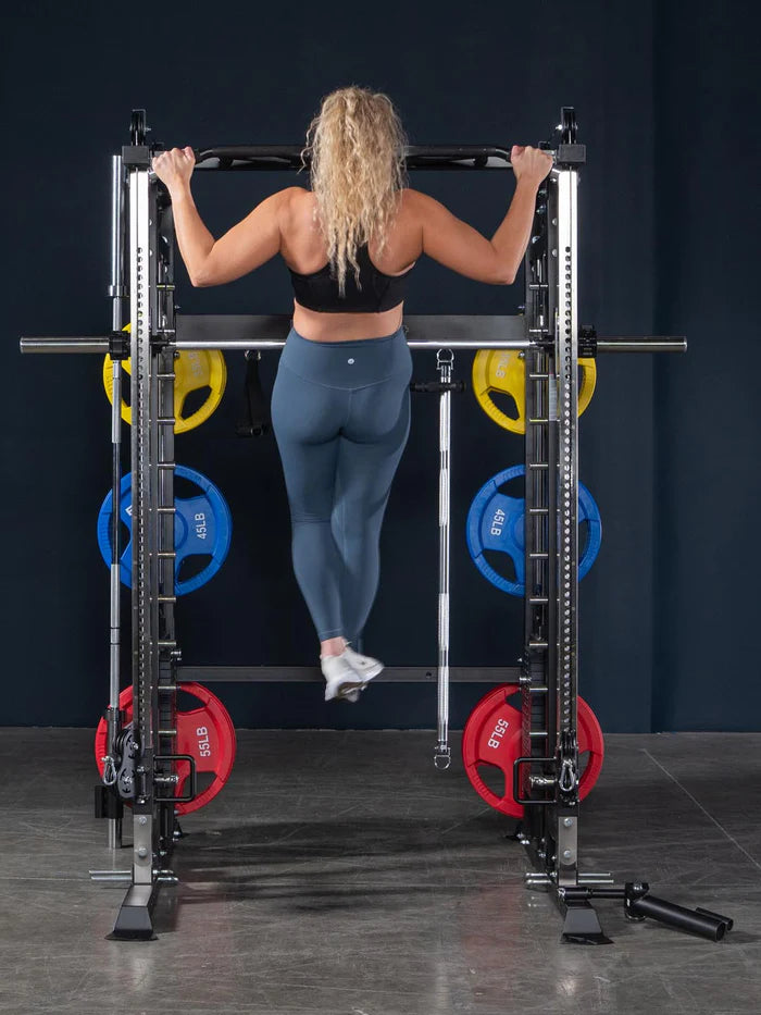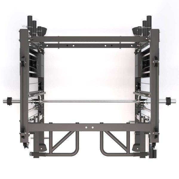 Інтегрована машина Сміта оснащена грифом 15,8 кг з насічкою та подвійними втулками по 30 см, розрахована на навантаження до 350 кг.
